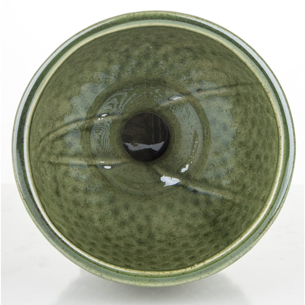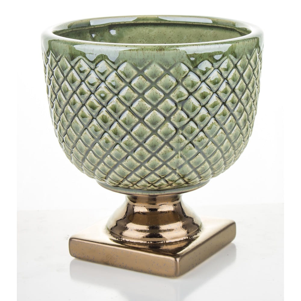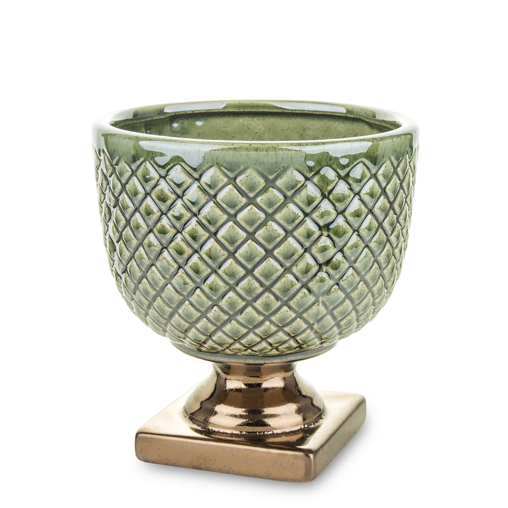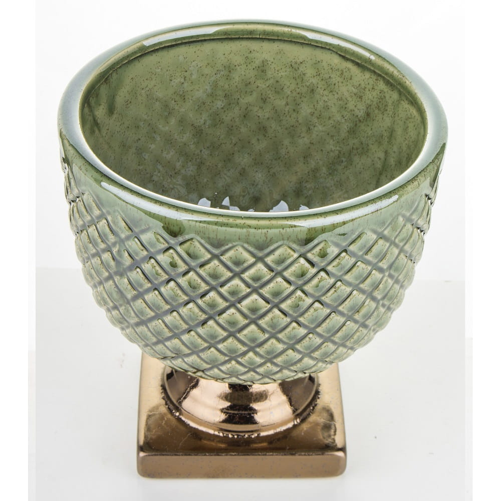 Piękna misa na mosiężnej nodze w odcieniu koloru zielonego. Szkliwiona powierzchnia z widoczną fakturą jest połyskująca co dodaje elegancji prezentowanej osłonce. Idealna dekoracja na kwiaty lub ozdoby suche.