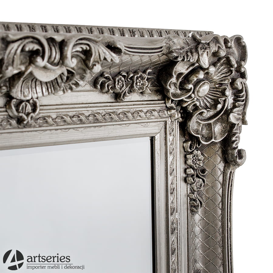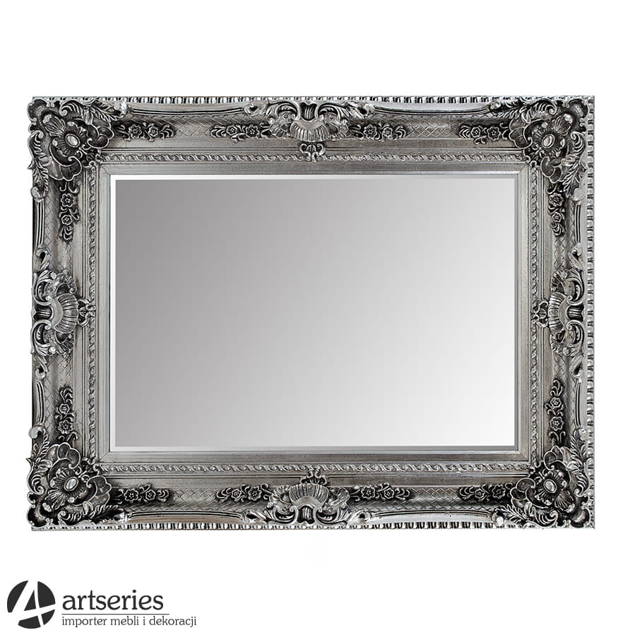 Przedstawiamy Państwu fazowane lustro w ramie stylizowanej wedle wzornictwa z antycznych pałaców. Posiada ono bardzo bogate dekoracje, których nie sposób przeoczyć. Ten niepowtarzalny styl podkreślony został srebrną, miejscami przecieraną barwą. Nasze lustro z pewnością doskonale wpisze się w styl chociażby Państwa salonu, czy też sypialni, jednak kreatywność naszych klientów już nie raz zaskoczyła nas samych!