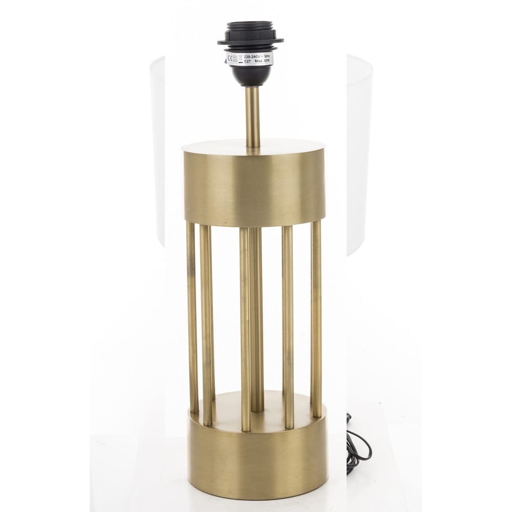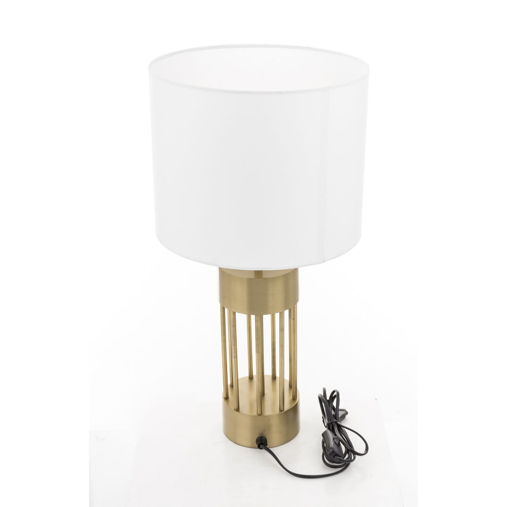 Gustowna lampa stojąca, stołowa ze złotą podstawą oraz białym, okrągłym abażurem. Polecamy szczególnie do sypialni jako lampa nocna lub do salonu na komodę by ładnie rozświetlić pomieszczenie.