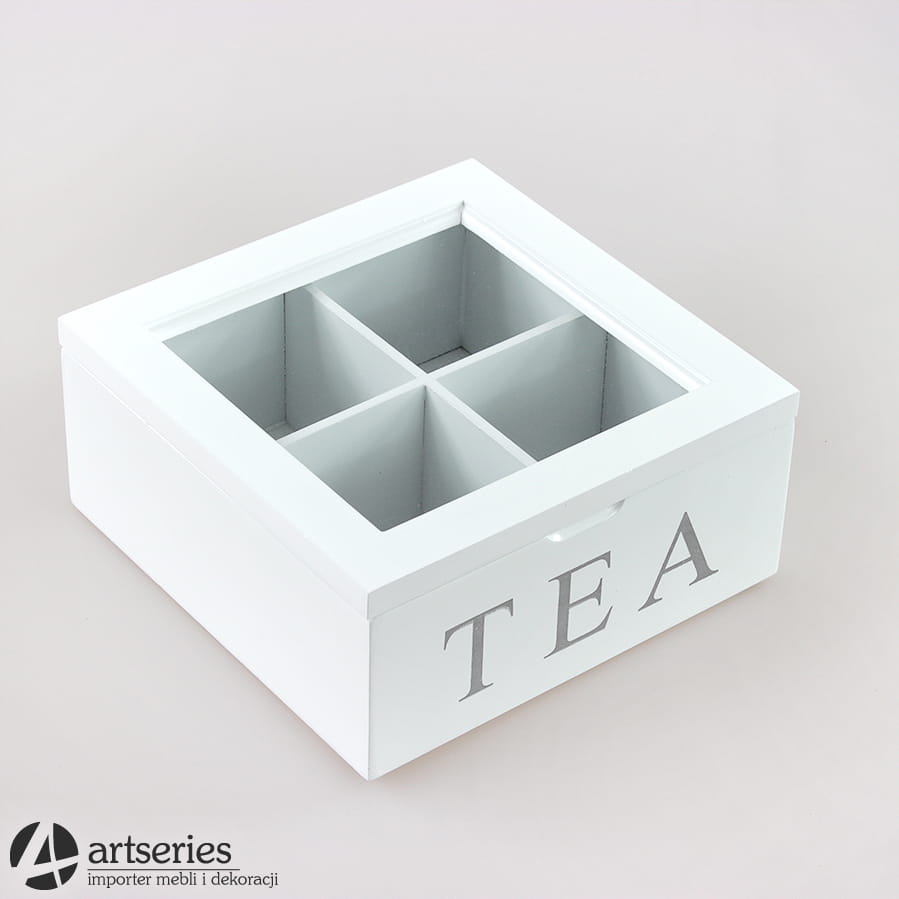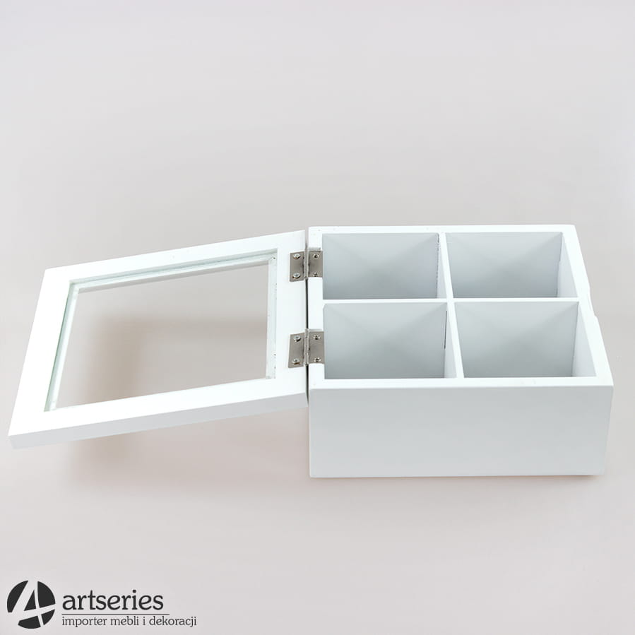 Pudełko na herbatę wykonane z drewna pomalowanego na biało. Posiada cztery równe przegródki. Wieko herbaciarki przeszklone.