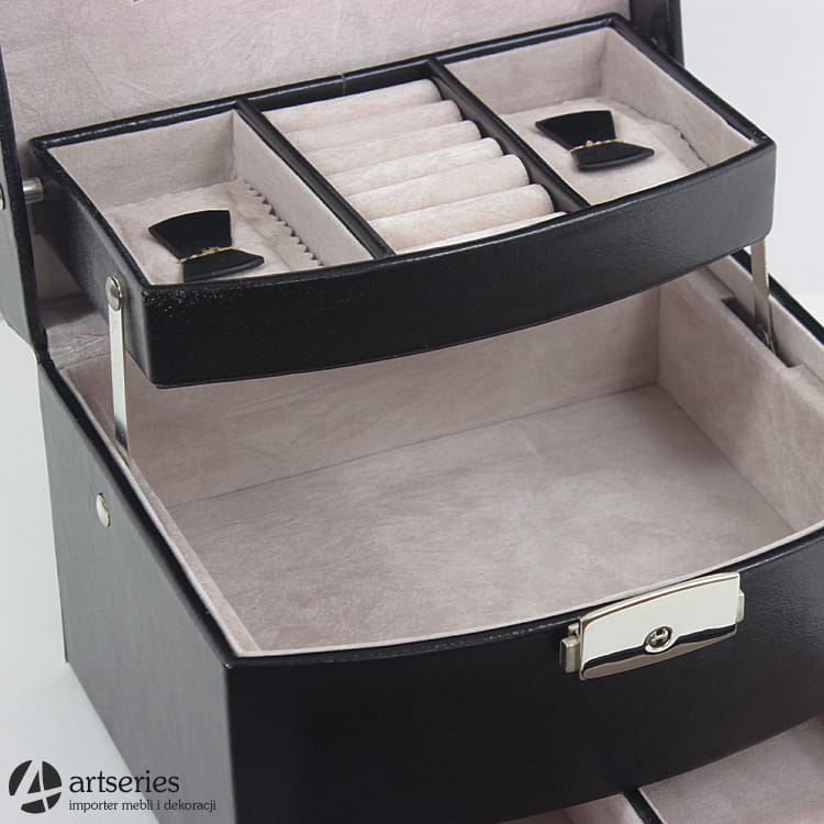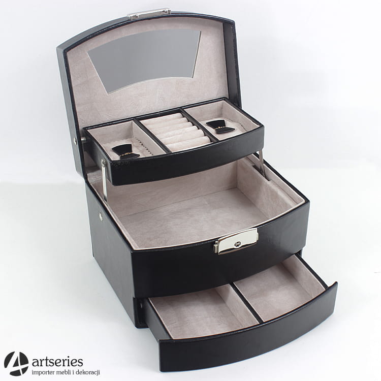 Szkatułka posiada otwierane wieko, pod którym znajduje się lusterko. Szkatułka posiada jedną szufladkę oraz pięć przegródek. Dodatkowo szkatułkę można zamknąć na kluczyk.