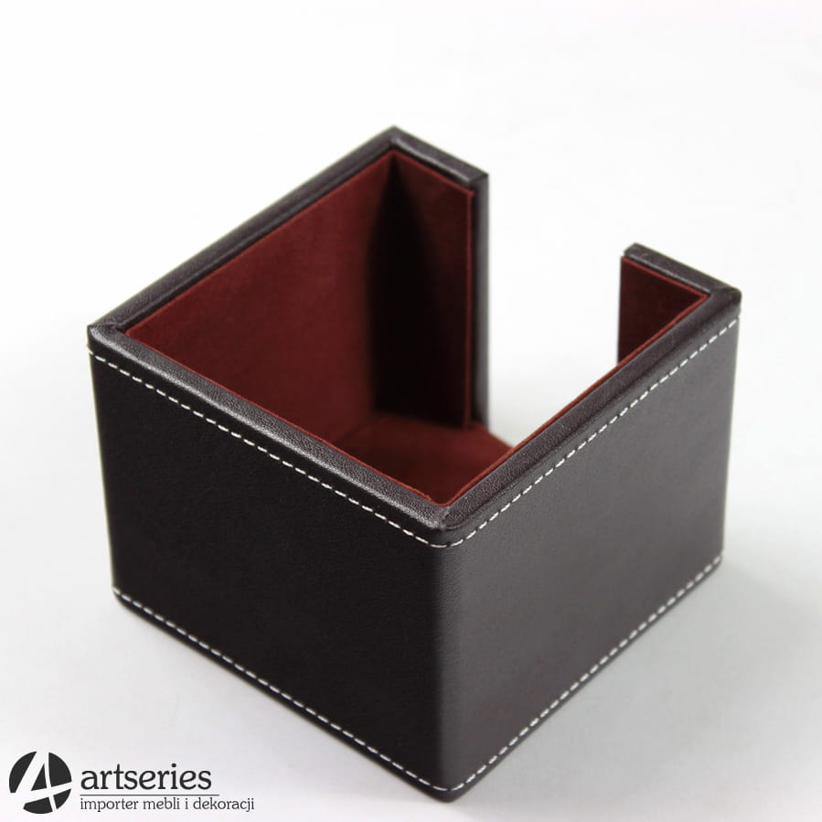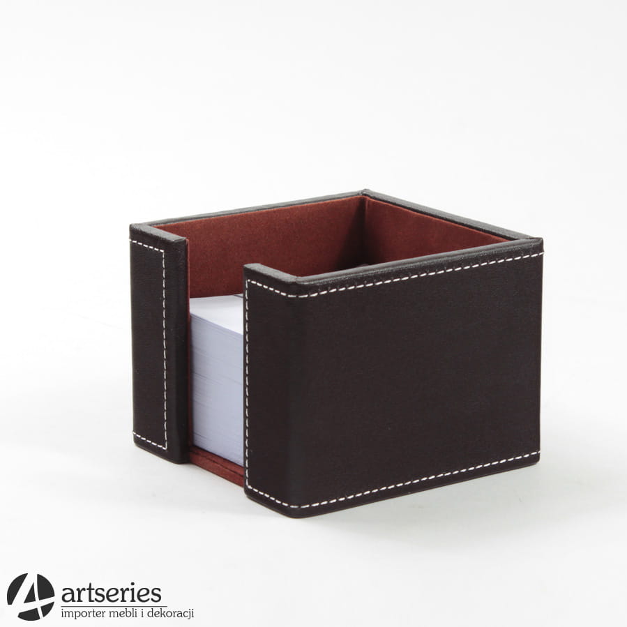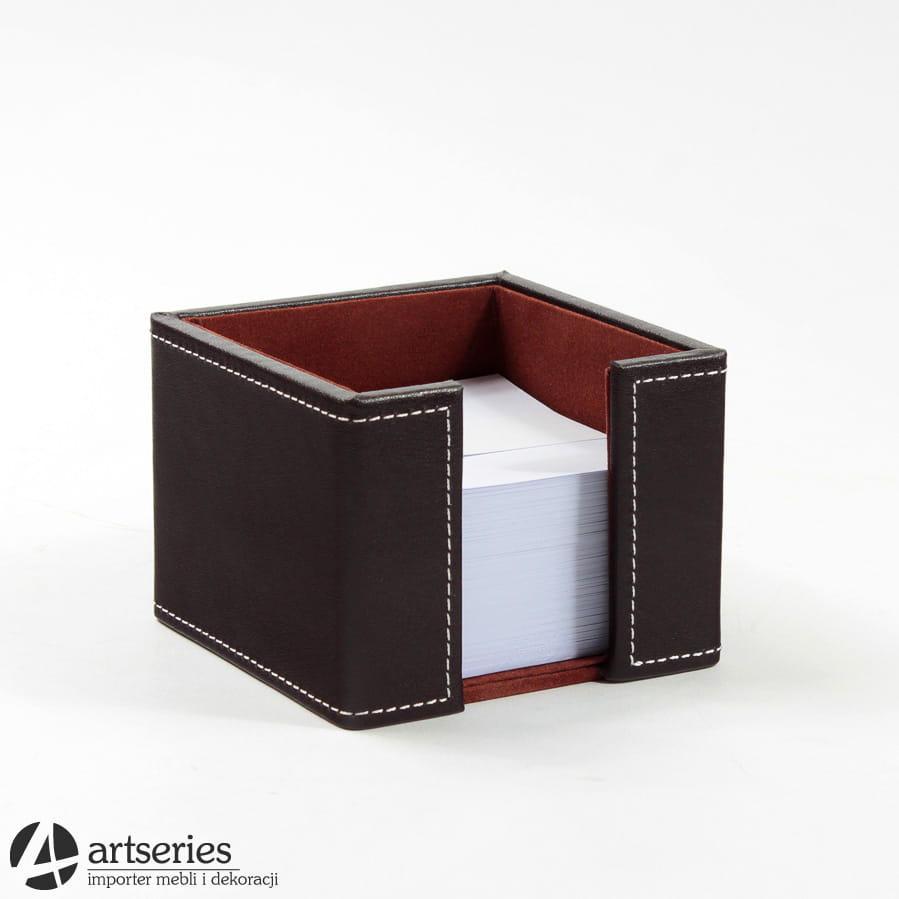 Podajnik na karteczki do gabinetu. Podstawa kwadratowa, od zewnątrz obity skórą.