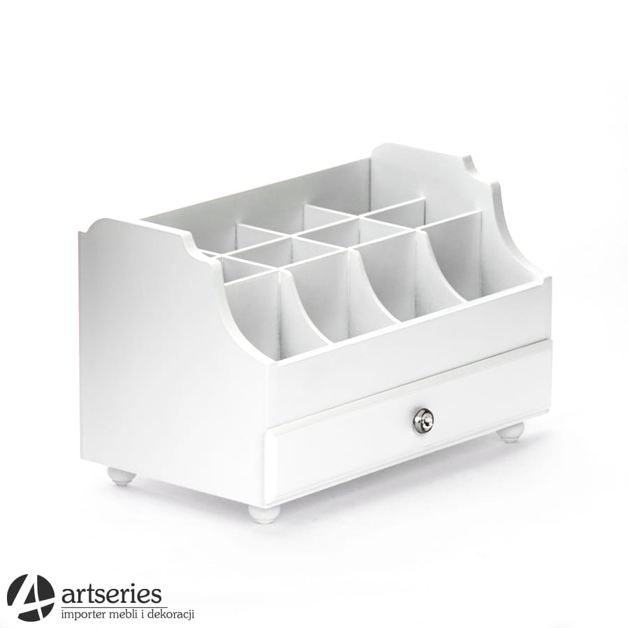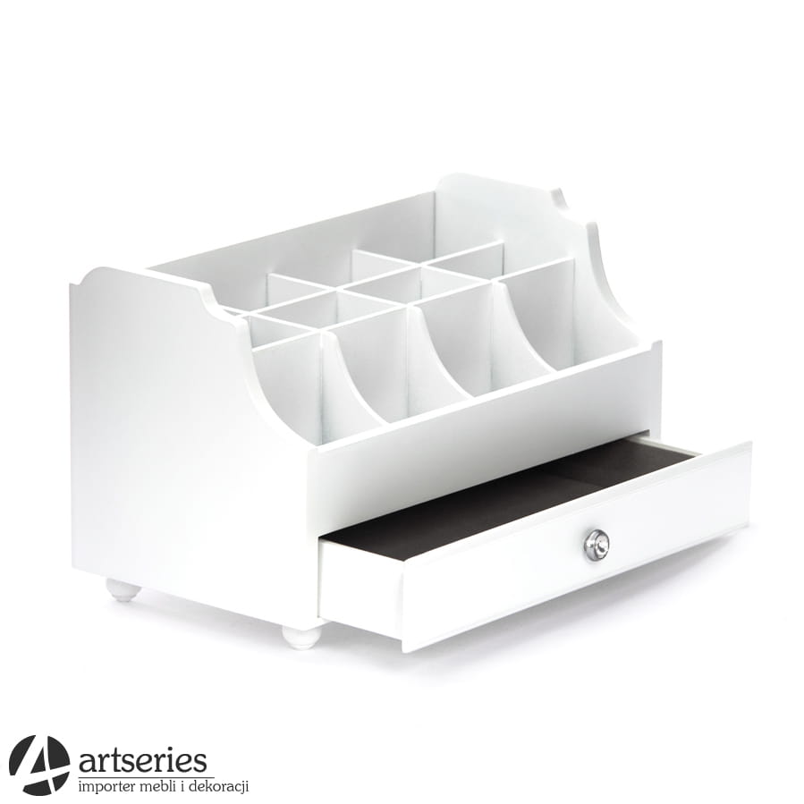 Organizer na przybory do makijażu z tej oferty wykonano z drewna. Duża ilość przedziałków, których jest aż dwanaście pozwoli zachować ład oraz należycie oddzielić od siebie różne akcesoria. Gustowny kształt przybornika podkreślony został białą barwną, a srebrny uchwyt szufladki stanowi prawdziwą wisienkę na torcie. No właśnie, organizer posiada również szufladkę, która pozwala na przechowywanie np. ulubionej biżuterii. Będzie to świetny dodatek do toaletek z naszej oferty!