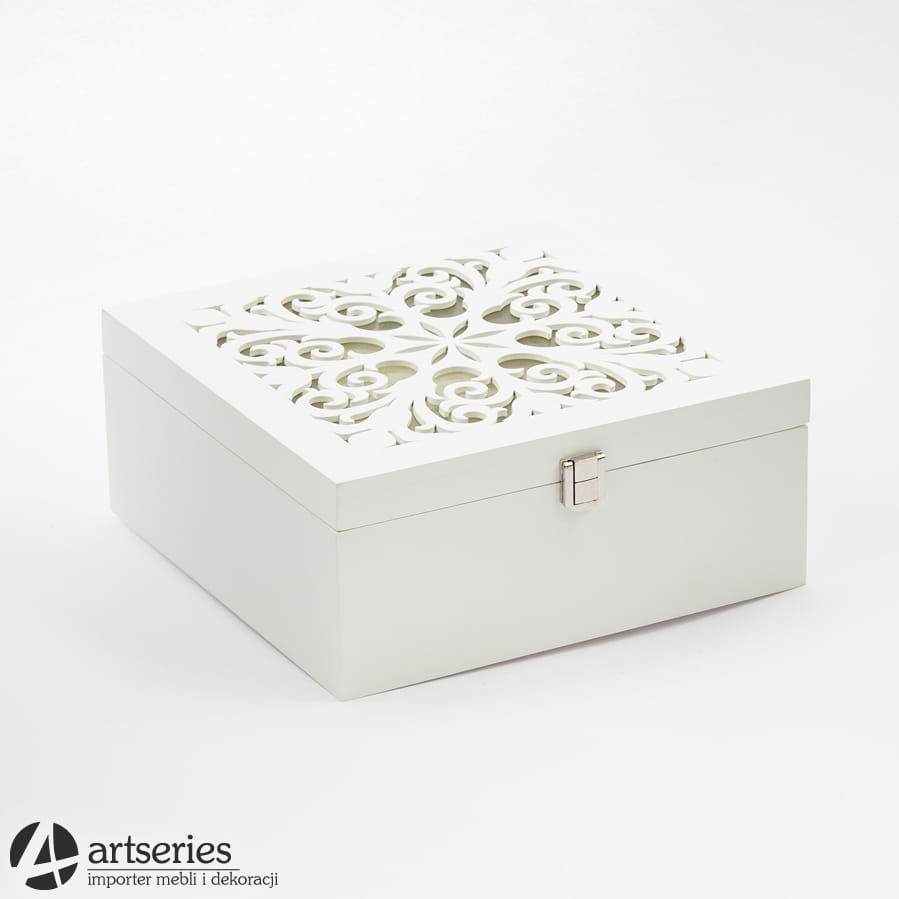 Piękna szkatułka na biżuterię z rzeźbieniami. Pomieści sporą ilość ozdób, a jednocześnie stanowić będzie ozdobę do stylowej sypialni bądź salonu.
