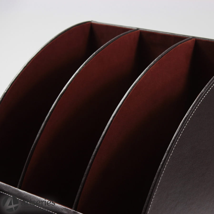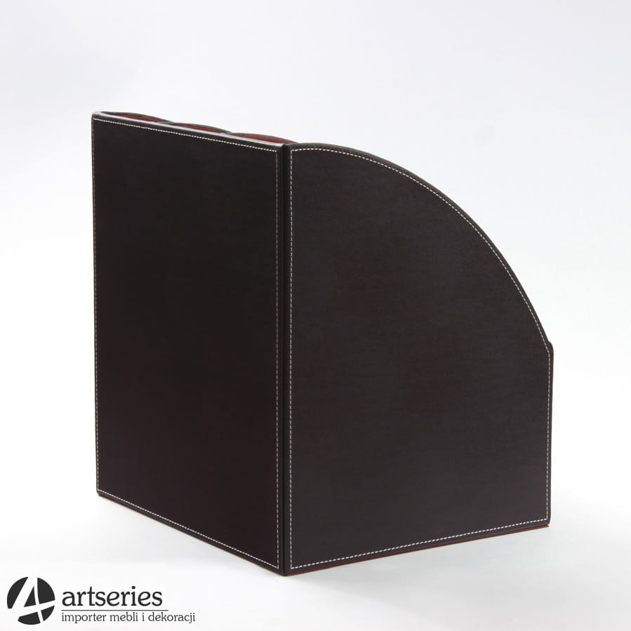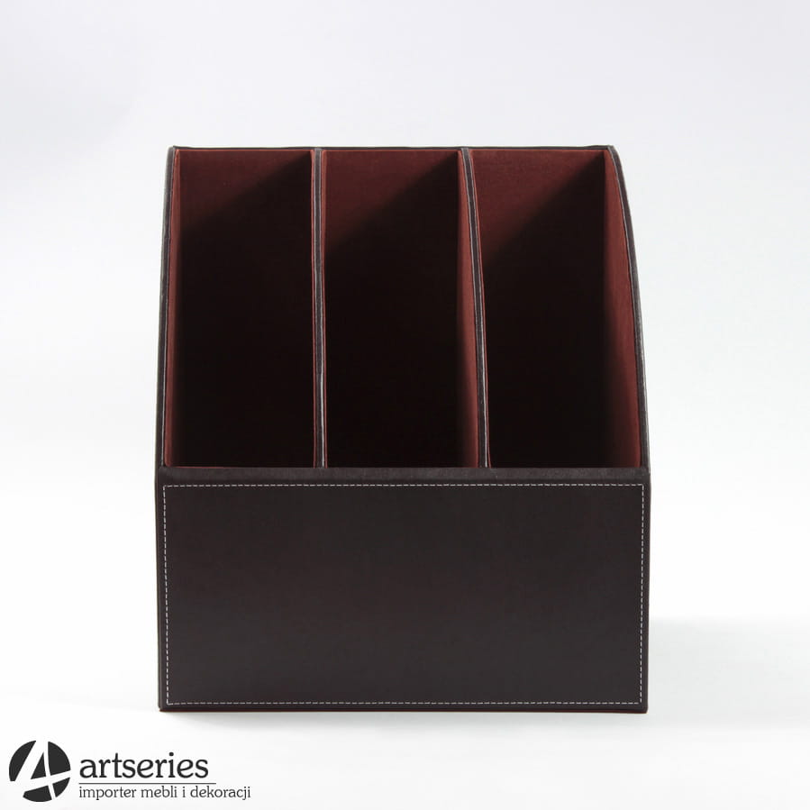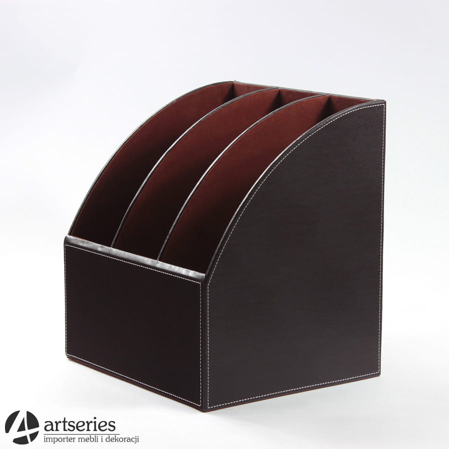 Segregator - przybornik na dokumenty. Od zewnątrz obity skórą w kolorze ciemnego brązu. Posiada trzy przegrody.