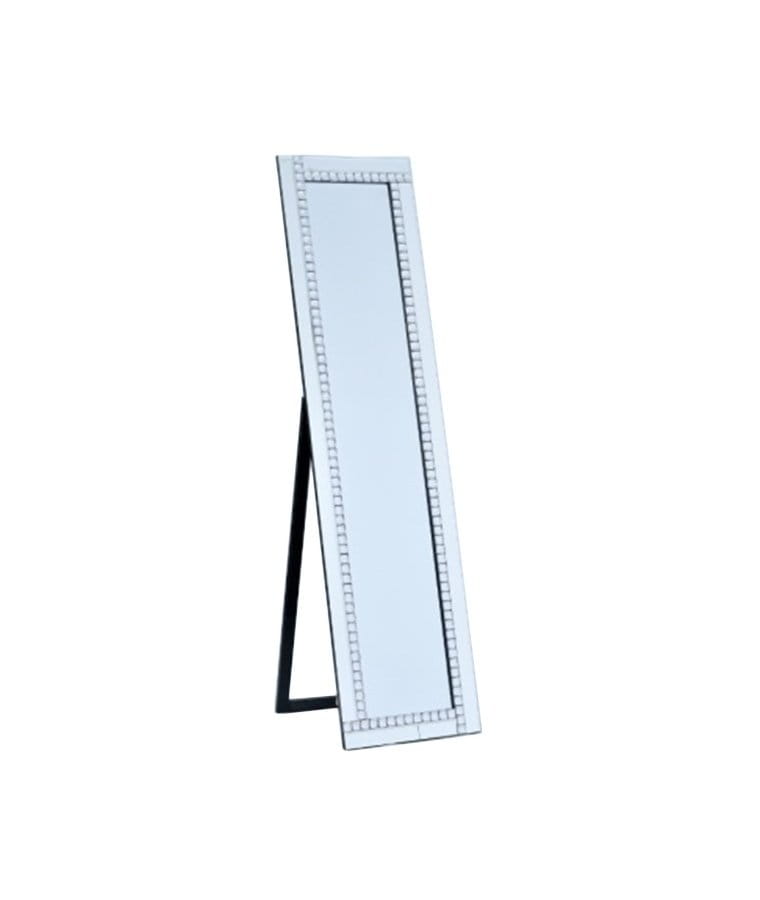 To wyjątkowe lustro stojące to synonim luksusu i nowoczesnego designu. Jego najbardziej charakterystycznym elementem jest szeroka, efektowna rama, której front został precyzyjnie wyłożony mniejszymi kawałkami luster. Taka konstrukcja sprawia, że rama nie tylko okala główną taflę, ale sama staje się aktywnym elementem gry świateł w pomieszczeniu.