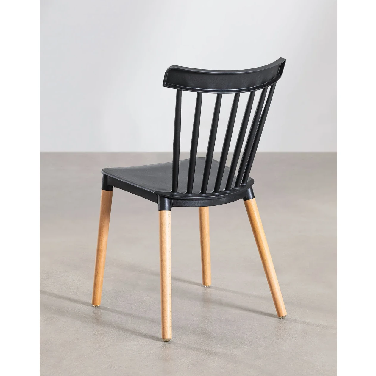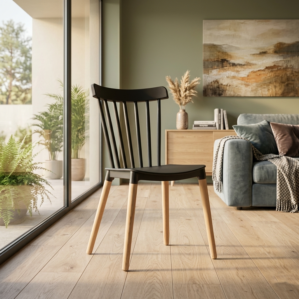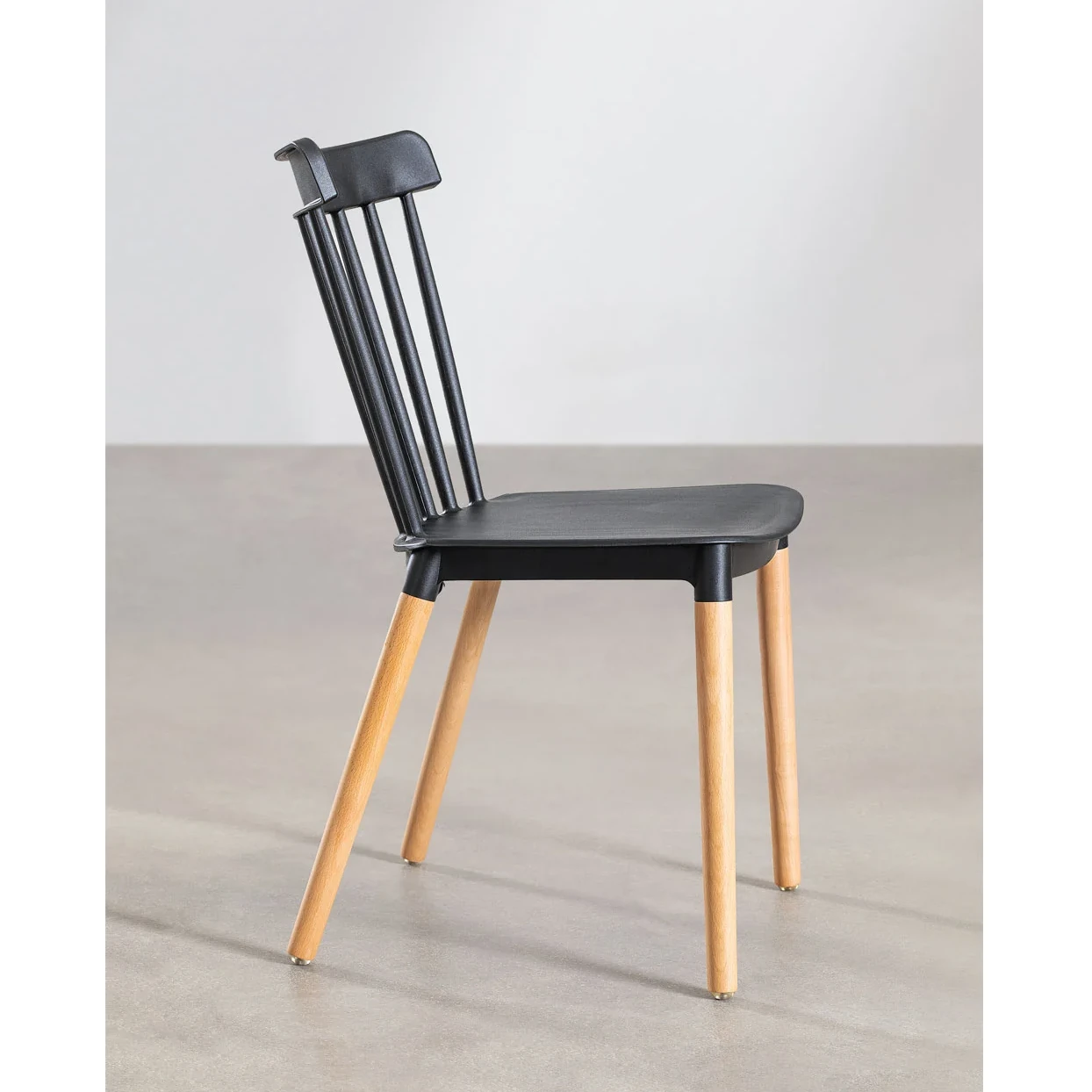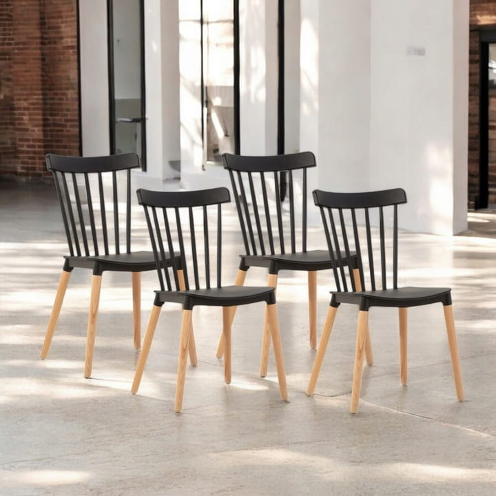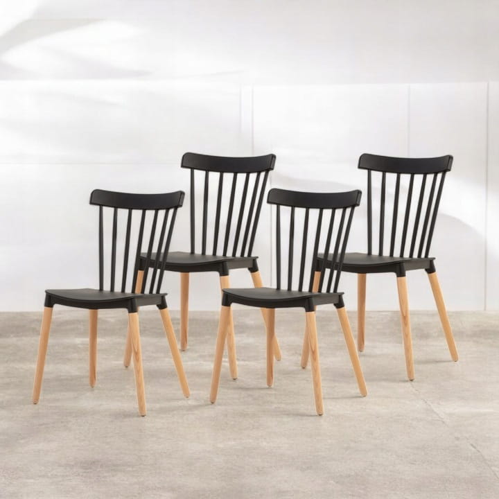Siedzisko i oparcie są wykonane z czarnego tworzywa sztucznego, co nadaje krzesłu świeży i elegancki wygląd. Oparcie składa się z pionowych szczebelek, które dodają mu lekkości i delikatności. Nogi krzesła są wykonane z litego drewna bukowego, w naturalnym kolorze, co kontrastuje z czernią siedziska i wprowadza element naturalności do całości.
