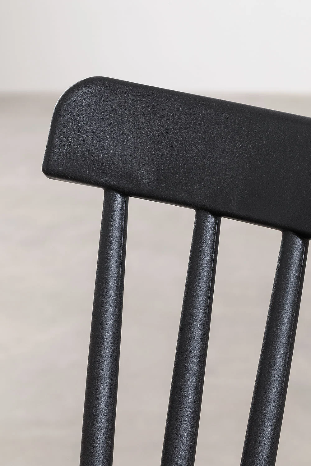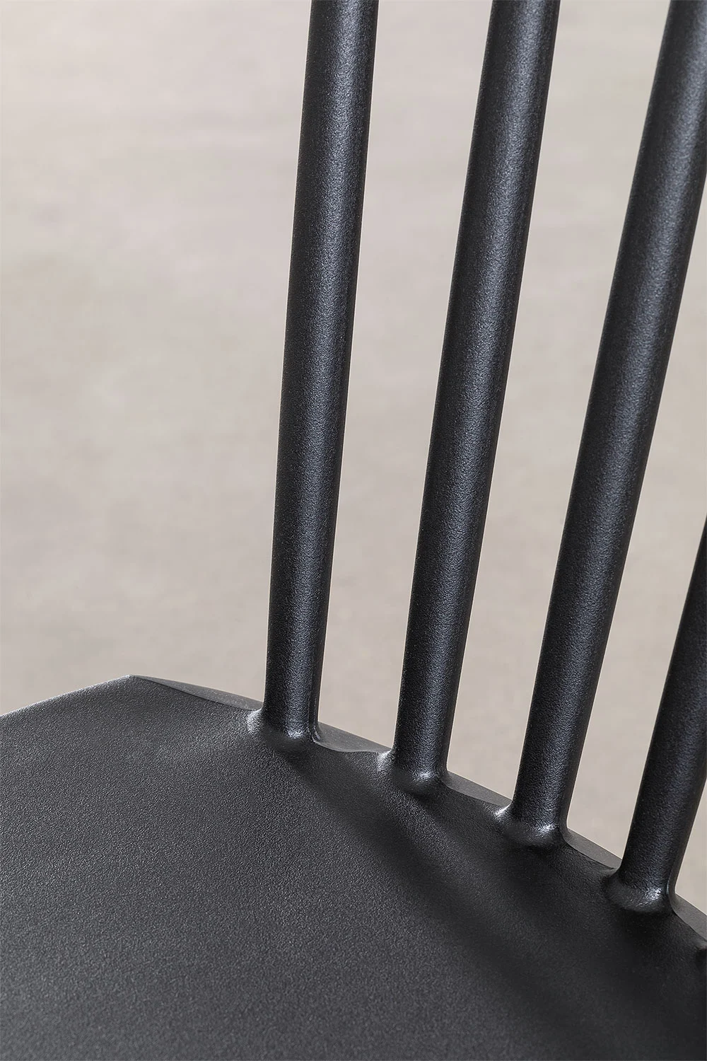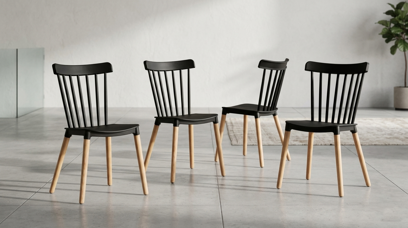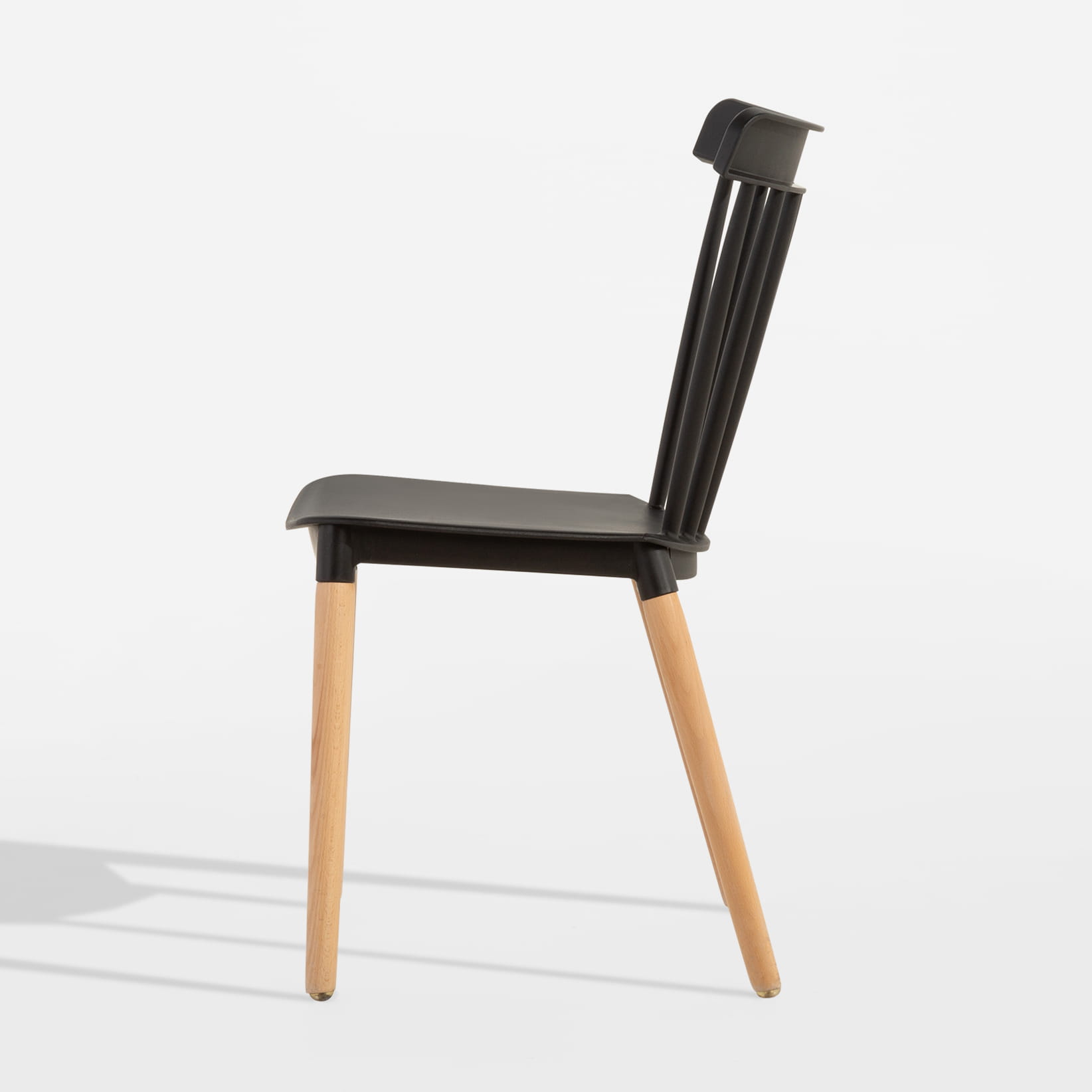 Siedzisko i oparcie są wykonane z czarnego tworzywa sztucznego, co nadaje krzesłu świeży i elegancki wygląd. Oparcie składa się z pionowych szczebelek, które dodają mu lekkości i delikatności. Nogi krzesła są wykonane z litego drewna bukowego, w naturalnym kolorze, co kontrastuje z czernią siedziska i wprowadza element naturalności do całości.