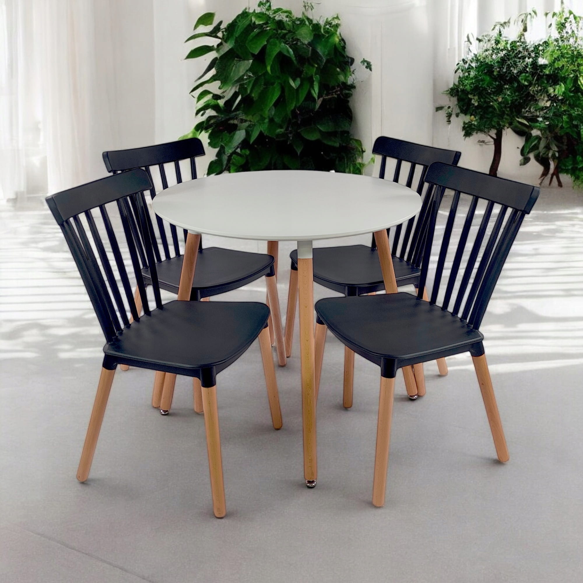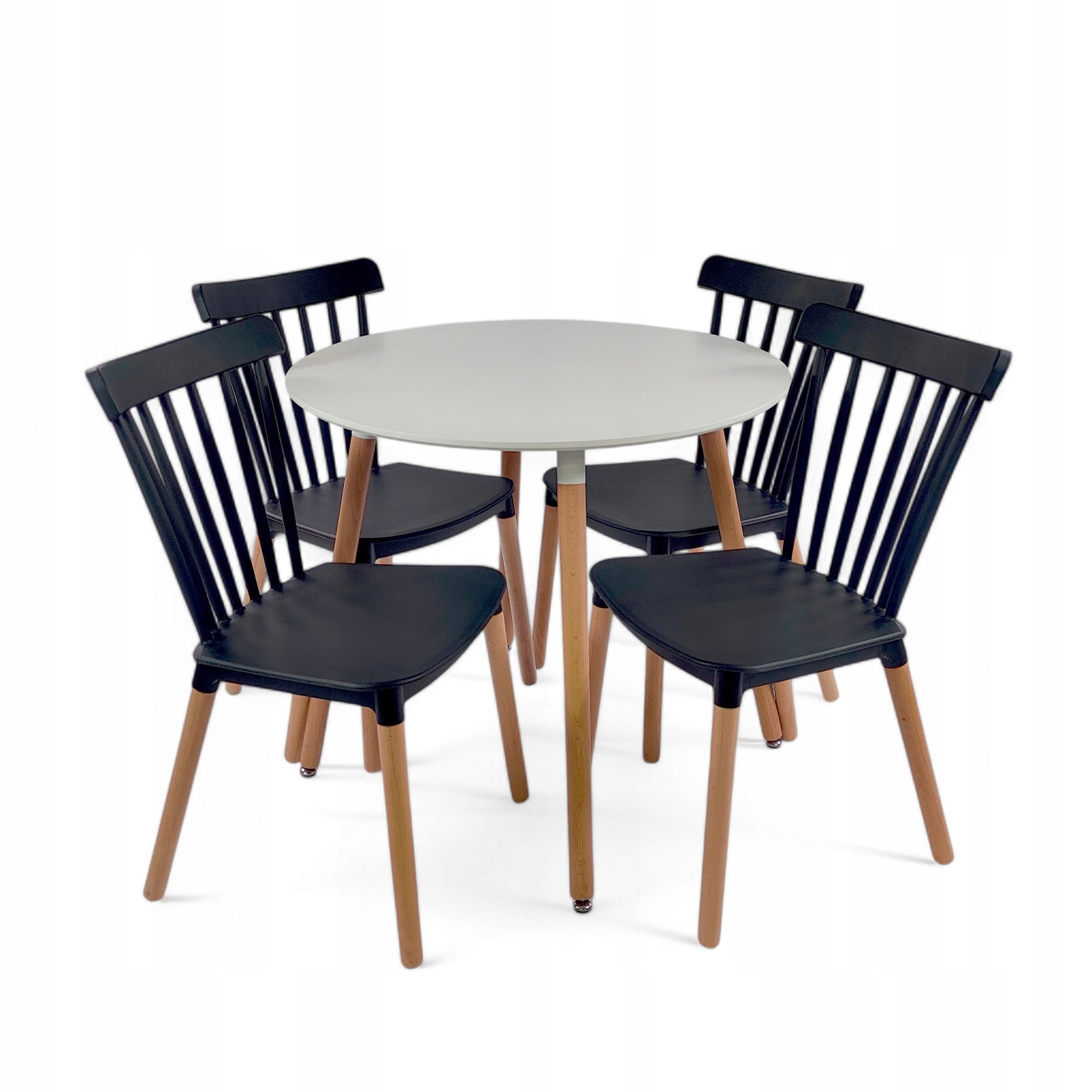 Elegancki zestaw stołowy składający się z okrągłego stołu oraz czterech krzeseł, idealny do nowoczesnych wnętrz. Stół charakteryzuje się minimalistycznym designem z białym blatem i drewnianymi nogami, które dodają naturalnego ciepła. Krzesła są wykonane z czarnego tworzywa sztucznego z drewnianymi nogami, co tworzy harmonijne połączenie klasyki z nowoczesnością. Proste, ale stylowe linie krzeseł zapewniają komfort siedzenia, a jednocześnie dodają wnętrzu charakteru.