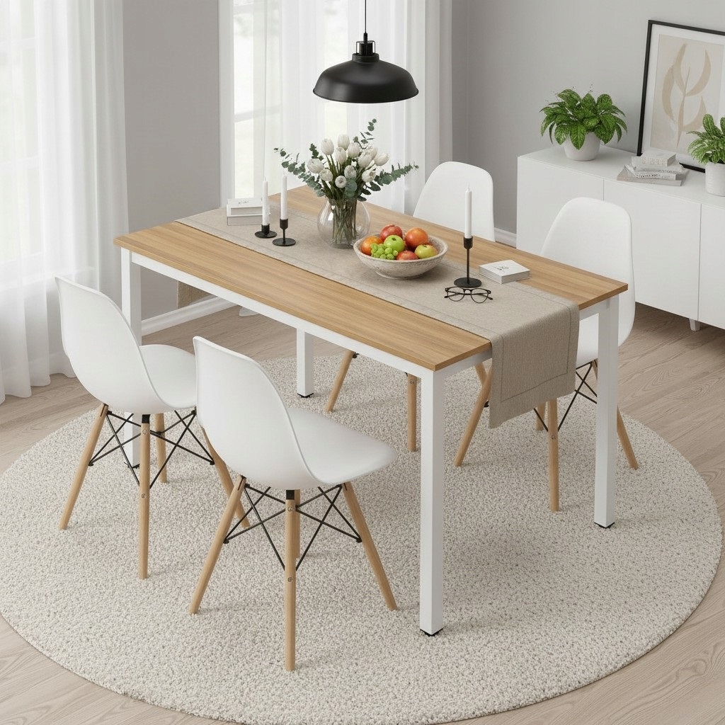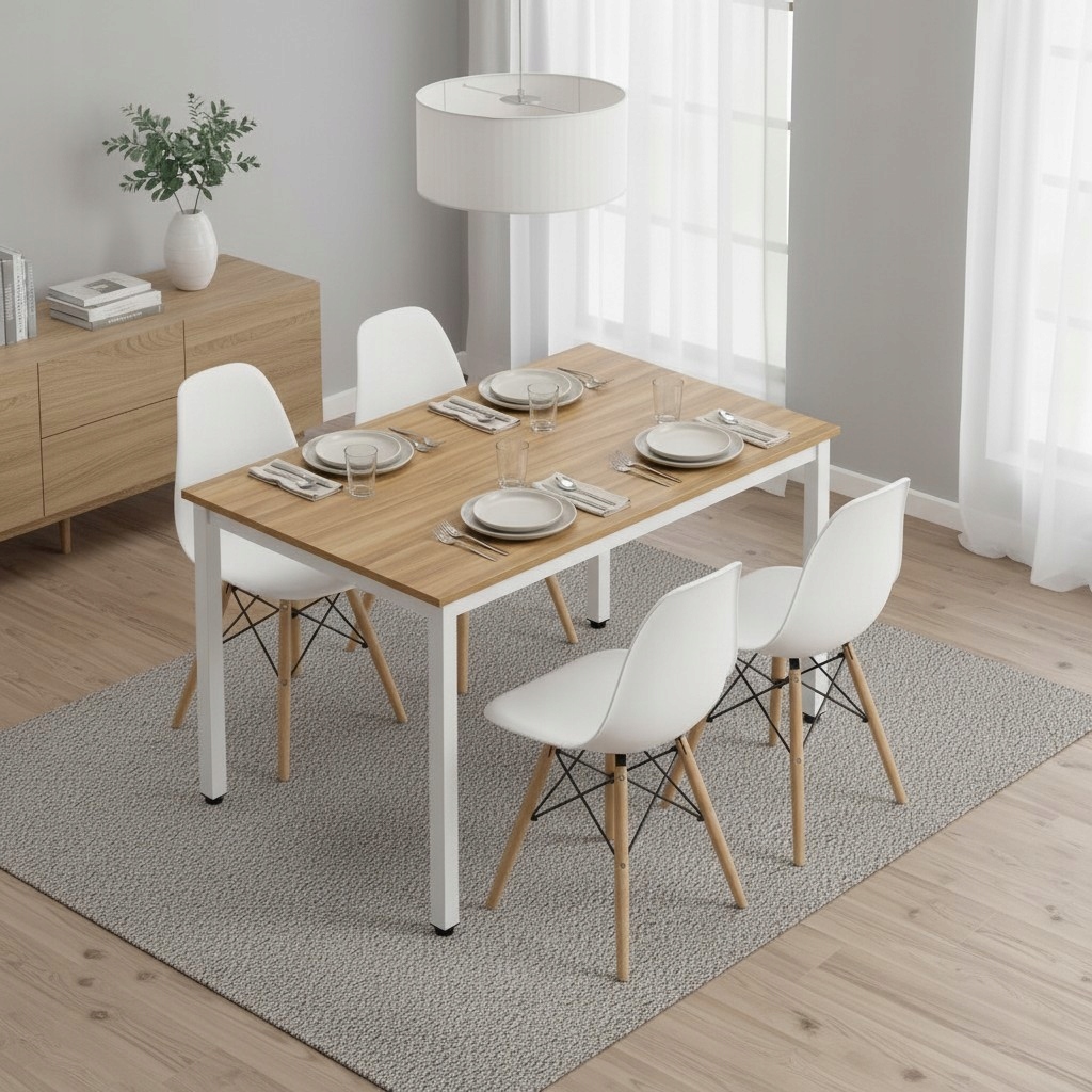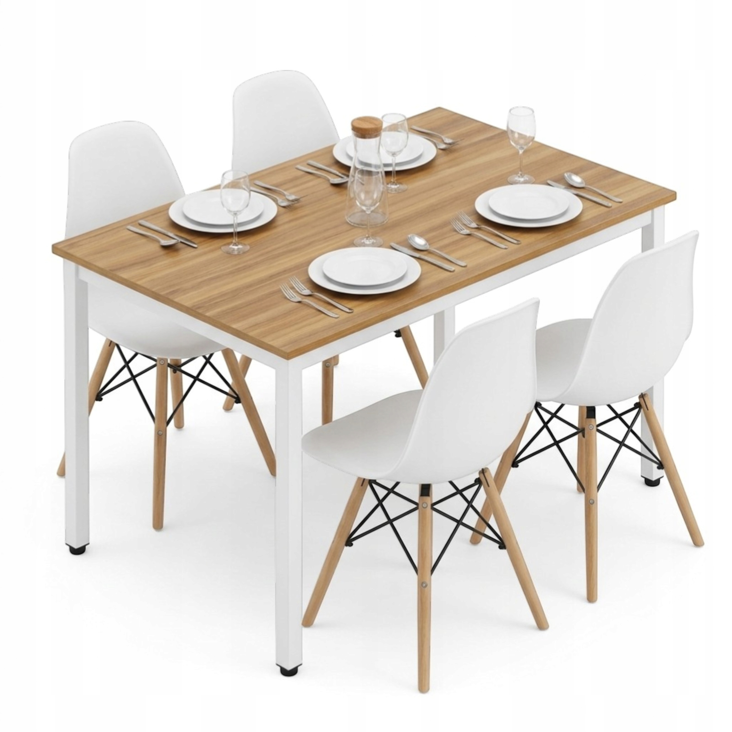 Zestaw stół + 4 krzesła skandynawskie to praktyczne i estetyczne rozwiązanie do codziennego użytku. Stabilna konstrukcja stołu na metalowych, jasno szarych nogach zapewnia trwałość, a ergonomiczne krzesła gwarantują wygodę podczas posiłków i spotkań. Minimalistyczna forma ułatwia dopasowanie zestawu do różnych wnętrz, a kompaktowe wymiary świetnie sprawdzają się zarówno w mniejszych, jak i większych przestrzeniach.