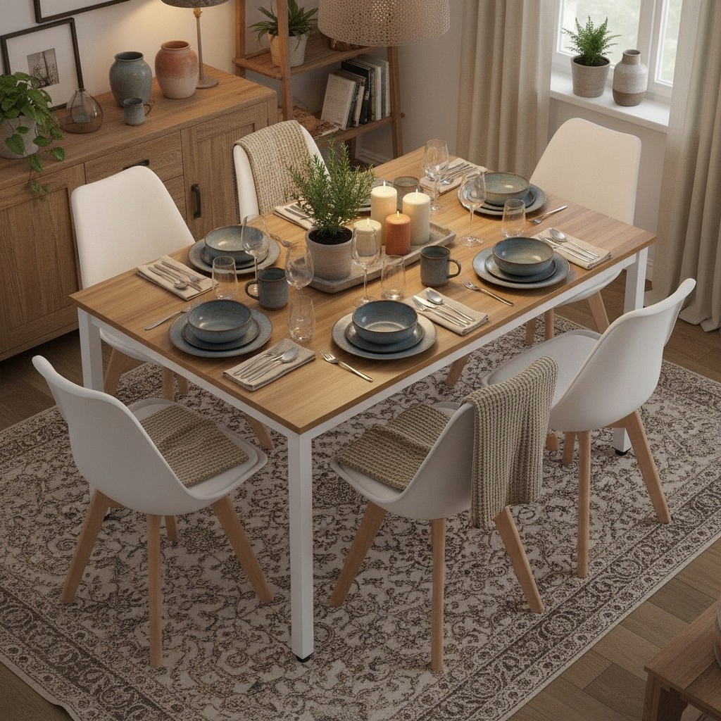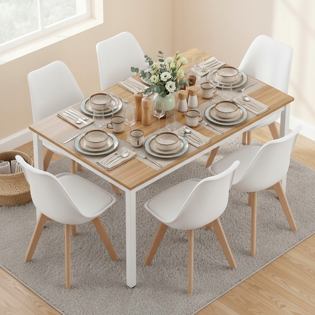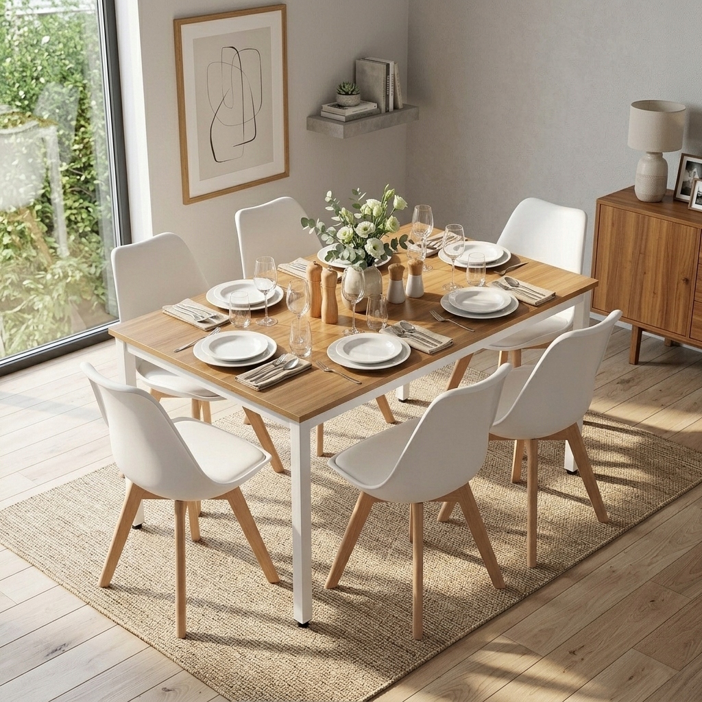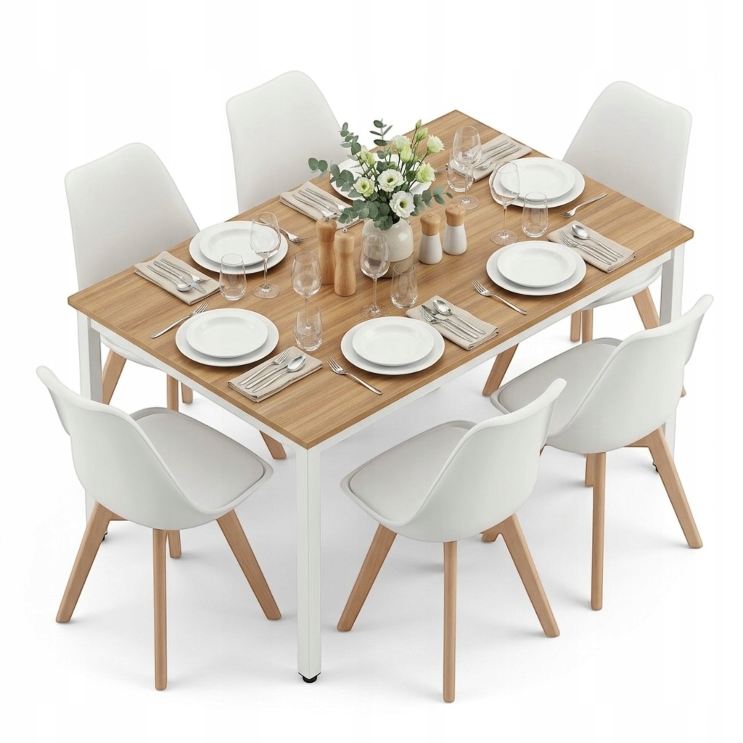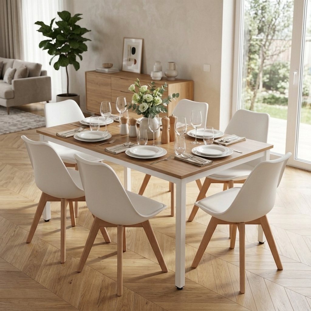 Zestaw jadalniany składający się ze stołu na stabilnej, jasnej konstrukcji oraz sześciu krzeseł skandynawskich to praktyczne rozwiązanie do codziennego użytku. Solidny blat w naturalnym odcieniu drewna jest odporny na zabrudzenia i łatwy w pielęgnacji, a ergonomiczne krzesła zapewniają wygodę podczas posiłków i spotkań. Minimalistyczna forma zestawu sprawia, że świetnie komponuje się z nowoczesnymi aranżacjami, jednocześnie optycznie rozjaśniając przestrzeń.