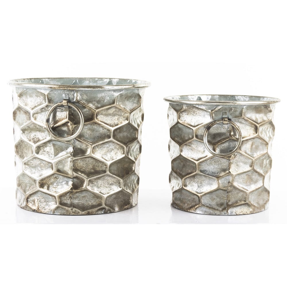 Prezentujemy nietuzinkowe, oryginalne, szykowne osłonki na doniczki wykonane z metalu w kształcie wiaderek. Osłonki wykończone w kolorze srebrnym będą pasować do większości wnętrz. Na uwagę zasługuje niebanalna faktura powierzchni oraz ozdobne uszka w górnych częściach. Komplet o wymiarach: 26x30x30 23x24,5x24,5 cm.