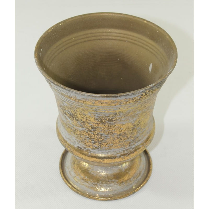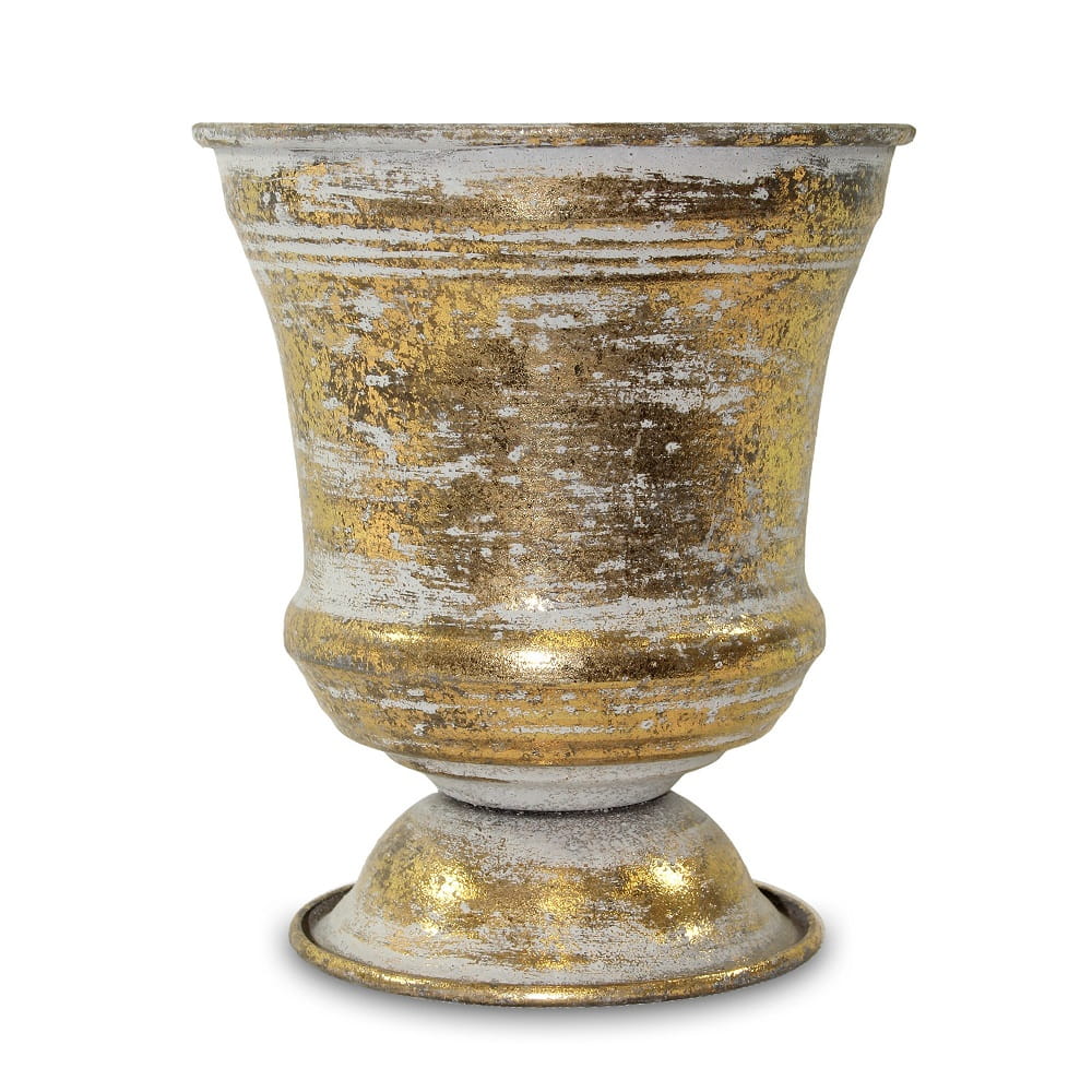 Złota, metalowa osłonka na doniczkę w kształcie kielicha wykonana w stylu antycznym. Osłonka ma kolor przecieranego złota, miejscami przebija odcień szarości. Umieszczony w osłonce kwiatek z pewnością będzie prezentować się wyjątkowo.